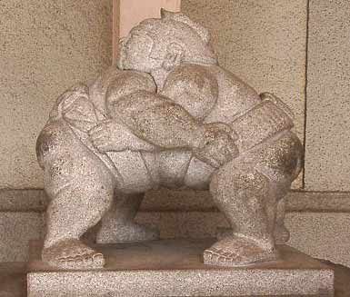 JR両国駅で降りれば、国技館はすぐ目の前です。 改札口を出たところに、「力相撲」と彫り込んだ大理石の像がありました。(写真左上) 見ての通り、おしりの辺りが黒光りしてるから、通りかかった人たちがさわって行くのでしょう。 隣の大江戸博物館へは何回か来たことがあったのに、国技館は初めて。 近くで見ると、凄くでかい建物。 きれいな「のぼり」の傍を通って、入場口へ向かう頃には、もう気分満点です。