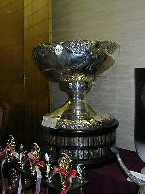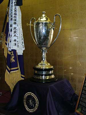 建物に入ると、エントランスホールの突き当たりに、優勝賜杯(左)と総理大臣杯(右)が陳列してありました。 力士達はこれを目指して、連日戦うんだなあ。