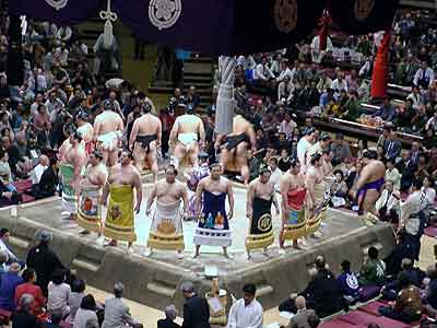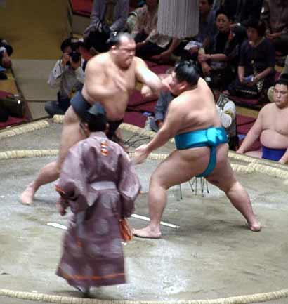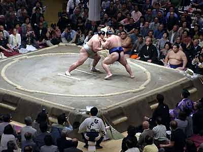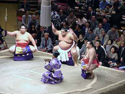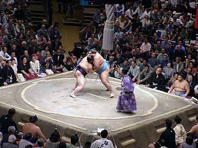左上の写真は幕内の土俵入り。 右は横綱武蔵丸の土俵入りです。 武蔵丸は、ひときわ巨体で、横綱の風格が十分でした。 十両の取り組みが始まる頃には、空席が目立ち、観客の歓声や拍手もまだまだでしたが、これからが幕内力士、強豪の出番です。 十両でもいい相撲が無くはなかったけれど、負けてもくやしそうな表情や仕草もなく、淡々とクールに引き上げて行く力士を見ると、ちょっと見てる方がしらけます。 全部見終わって振り返って見ると、会場が盛り上がったのは、やはり中入り(十両の取り組み後の休憩)以降に、幕内力士が登場するようになってからでした。 さすがに、金を稼げる力士達の相撲は、スピードも迫力も入退場の物腰さえも違います。 何しろ「ばしっ」という感じで、張り手の音が2階席までこだましてくるのだから。 巨体が激突し、すさまじい取り組みが終わると、力士の体は紅潮し、肩で息をしています。 取り組みによっては、力士の体が背丈くらいの高さまで持ち上げられたり、土俵下へたたきつけられたりします。 そのたびに観客は、地響きのように「どっ」と沸きます。