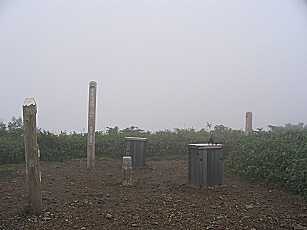 開けた山頂で、山々の位置を書いた案内板があるが、ガスで全く展望なし。