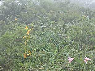 しかし、ガスで薄い乳白色の大気の中、ササユリのピンクやニッコウキスゲの黄色が浮かび上がり、幻想的な雰囲気を醸している。