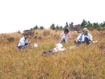 雨の土曜日、スキー場の駐車場にテントを張る時も、さらさらと降っている。 持ち寄りのアテと酒と好き勝手なおしゃべりで、すぐに就寝時間。 翌日、曇り空の下、百合谷林道を奥まで入り、車を置いて歩き始める。 リーダーがこの山に決めた理由は、ミズナラの木が多いから・・・? マイタケは、太いミズナラの木に付くそうな。 そう言うわけで、(キノコが付いてそうな)いい木があれば、斜面を駆け上がり、太く適度に古そうな倒木を見つければ、斜面を下る。 そうこうしていても、頂上には昼前に着き、さて白山の展望は・・・まったくない! 頂上からは、谷の向こうに紅・黄・緑と色が混じった斜面がきれいだ。 黄色の絨毯と化した草原に座り、ゆっくりと昼食を取る。 白山方面からのヘリコプターの音だけが雲の中を通過していく。 三角点は灌木の中で、少し探したが見つからなかった。 下山中も、あっちへガサゴソ、こっちへガサゴソと探すが、ヌメリスギタケが少し取れたぐらいで、ほとんど収穫なし。 びっしりと木に付いている月夜タケが、ヒラタケに見えてくる。 下山後、白山桑原総湯(300円)で汗を流す。 浸かっていると肌がヌルッとする美男の湯だった。 (山) |