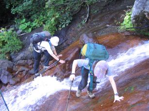 斜里岳登山口まで、林道をけっこう走る。 さあ−てと登り始めて、ビールを忘れた事に気づき車まで取りに戻る。 時間よりビールが大事か?(もちろん!) 今日は晴れて、沢登り主体のこの山には好条件だ。 下の二股まででもいくつかの渡渉を繰り返し、上の二股まで旧道の沢登りの道となる。 沢登りと言っても、ほとんど水の上に出た岩の上を渡っていくだけであり、水没していても靴を濡らすほどではない。 ここの沢は鉄分が多く、岩は赤く染まっている。 鉄分が多いから、靴もあまり滑らず、安心して渡っていける。 渡渉ばかりでなく、滝の横をへつったりと、初級の沢登りで、メンバーは喜々として登っていく。 上の二股からは、沢も細くなり面白味に欠けるが、ガマンして登れば頂上に着く。 頂上の先の三角点の辺りに陣取り、宴会を始める。 梅さん特製の料理で、ビールもうまく、それにしても、天気が良いのが一番のご馳走だ。 1時間もゆっくりして、さあ降りようと思うと、周りも降り始める。 みんな、天気が良いのでゆっくりしていたようだ。 下りは、上の二股から新道の稜線を行く。 熊見峠までは、普通の稜線歩きだが、ここから下の二股までが、木の根が張りだし、段差が1mもあるところもあり、斜里岳一番の難所だ。 それでも、新道を登ってくる人もあり感心する。 やっとの思いで、下の二股まで降り、ホッとする。 ここからは、また渡渉を繰り返し、登山口まで戻る。 次に向かうのは雌阿寒岳で、途中で霧のない摩周湖を見物したり、よく分からない「ホワイトラーメン」(ミルクベース)を食べたりしながら、オンネト−野営場に向かう。 オンネトーの温泉は昔ながらの古い浴室で、暗く体も洗えないので、露天風呂でゆっくり浸かる。 しかし、シャンプー・石けんを使えないのは中途半端で、洗った気がしない。 (山) |