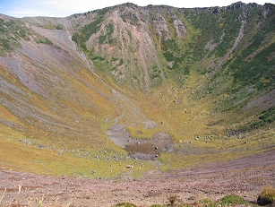 北海道も4回目となれば、要領も覚える。 ガスボンベは、千歳空港内の売店で売っているのをチエック済み。 予約していたレンタカーは、アコードワゴンの走行8000kmの新車! 羊蹄山に向かう道のスーパーで買出し、そこで教えてもらった「味の一平」でミソラーメンを食べる。 冷めないスープで汗をかき、野菜たっぷりで実に美味しかった。 支笏湖の脇を走り、羊蹄山の登山口である半月湖野営場(無料)に着いたのが既に夕方だった。 テントを設営後、倶知安温泉に行く、源泉かけ流しで良いお湯だった。 翌朝、テントをたたみ、いよいよ百名山98番目となる羊蹄山に出発する。 さすが蝦夷富士と呼ばれる独立峰で威風堂々、裾野の端から取り付くのでなかなか高度が上がらない。 道はよく整備され、土曜日だからか人も多い。 すぐ西にあるニセコアンヌプリは、ガスがかかり全容が見えない。 登るにつれて坂も急となり、樹林帯を抜けたあたりで、9合目の分岐に着く。 普通は真っ直ぐ上がって時計回りで山頂に達するのだが、我々は避難小屋経由反時計回りで登る。 最後の登りは急だが、登り切ると火口が覗ける。 9合目ぐらいから紅葉が始まり、火口の中も草紅葉がきれいだ。 岩稜帯を過ぎると、やっと羊蹄山頂上だ。 4つの登山道から登ってくる人で、けっこう混み合っている。 山頂で乾杯をし写真を撮り昼食とする。 百名山まであと残り2山のピース写真を撮り、山頂より北に進むと、三角点がある。 さらにその先には旧山頂の標識があり、頂上が変わったことが分かる。 9合目まで降りて、登ってきた道を延々と下る。 下る途中で、やっとガスが晴れたニセコアンヌプリを写真に撮る。 羊蹄山に比べれば、丸こい山だが、いい山だ。 野営場に戻ったのが17時過ぎ、実に10時間半かかってしまった。 ニセコには日本三秘湯の一つである「薬師の湯」があり、これは外せないと、ニセコサヒナキャンプ場へ行く。 土曜日なので、満員状態だったが何とかテントを張らせてもらう。(3100円) 念願の薬師の湯(300円)は、赤みを帯びた湯で、底には岩が敷いてあり、湯が湧き出ている。 混浴だが、女性は入りにくいだろう。 気持ちのいい湯だが、洗う場所がないので、また服を着て、内湯(男女別)に入りに行く。 こちらは、無色できれいなお湯で、やはり底は岩が敷いてあり、湯が湧き出ている。 後で調べると、戸外に白濁色の露天風呂(混浴)があるそうなので、3種類の源泉があることになる。 明日は、ニセコアンヌプリに登ろう。(山) |