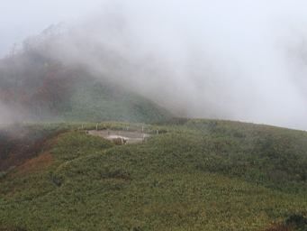 ポツポツ! 6時頃だろうか、予想より早く降り出した雨がテントを打つ。 冠山峠の石碑の右に烏帽子冠が灰色に浮かぶ。 雨支度を調え、さあ行きますか。 アップダウンを数回繰り返し、黄葉・紅葉の中を歩く。 冠山は大きくなりながらずっと見えている。 陽が射していれば素晴らしい景色だろうに、残念。 冠平は、休憩に最適な平地だ。(晴れていれば) ここから先は山頂まで岩場混じりに急登だ。 最初の岩場は水が流れを作り、ロープが下がっている。 登れても下りが不安だ。 ガスも出てきた。 無理はしないと、ここで登頂を諦める。 冠山峠まで戻る、所要時間2時間20分、また天気の日に来よう。 (山) |