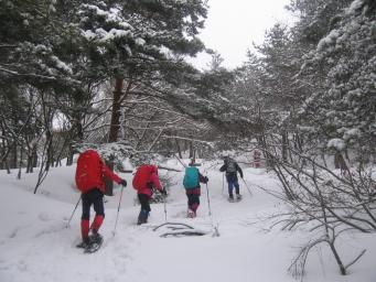 7時半、烏丸御池出発、八瀬を抜け「途中」から湖西道路に出て、マキノスキー場に向かう。 朝の天気チェックでは滋賀北部は曇り・・のはずが、雪がちらついている。 ファミリーで賑わうスキー場からスノーシュー・ワカンを付けて歩き出す。 雪はサラサラと降り続いているが、風も弱く登りになれば汗ばむほどだ。 例年より雪が多く、スノーシューの感覚を確認しながら登る。 今回初使用の「エキスパートの21th黒竜」はジュラルミン製の登山タイプで、サイド・前後ともにアイゼン様のブレードが出て、簡易ヒールリフターが付いている。 黒竜のインプレッションは、雪原や堅めの雪面では雪を捉えて歩きやすいが、柔らかい雪の登りではブレードが効かず、平らな底面のために滑りやすい欠点があった。 欠点をカバーするためには、雪面を押しつけてブレードを効かす必要がある。 その点、ワカンは欠点も多いが、どんな場面でも「そこそこ」行けるのがいい。 スノーシュー・ワカンともに欠点はあるものの、ツボ足で歩く事を考えたら、雪山を楽しめ、疲れも雲泥の差だ。 Kさんを先頭に、いいペースで登ってきたが、粟柄越から頂上への無木立の稜線は暴力的な風と雪つぶての地獄が待っていた。 目出し帽を被れば良かったと後悔も後の祭り、顔の左側が痛く、皮膚感覚が痺れていく。 目の前の頂上が遠い・・。 立ち止まり立ち止まり、やっと着いた頂上は立っているのもやっとで、写真撮影をしてさっさと撤退する。 樹林帯に入ると、ウソのように風も弱まり、地獄と天国の差だ。 滋賀の低山で、厳冬期の雪山の厳しさを体感できたと喜ぶのが北嶺会流・・? 風が弱い場所まで下り、用意してきた豚汁やおでん、熱燗で暖かい昼食を取る。 体も温まり極楽極楽。 休憩舎で少し休憩し、ガシガシと雪を踏み、ある者は尻セードをし、楽しく登山口まで下る。 さらさの湯は一杯だったので、近くの白谷温泉に入って京都へと帰る。 (山) |
