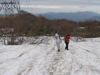 前回と同じルートで赤坂山に向かう。 海津大崎で少し寄り道をし、満開の桜のアーチをくぐる。 桜は散りかけていたが、この時期は華やかなピンクで彩られる。 ちびっ子が雪遊びをしていた2月のゲレンデは、グラウンドゴルフの芝コースとなっていた。 いつもながらの急な木段を上ると、すぐに汗ばむ。 マンサクの花さえまだ咲き始めで、今年は山の春が遅い。 色彩の少ない登山道を登ると、1時間ぐらいでブナの木平の休憩舎が見えてくる。 少し休憩してから歩き出す。 堰堤を越えた辺りから雪が多くなり、予期せぬ雪山歩きになる。 歩きやすい雪なのでアイゼンは不要だが、スパッツは有った方が良かった。 鉄塔を過ぎ、雪の斜面を登ると、稜線には雪がほとんどなく、やがて赤坂山山頂に着く。 南に琵琶湖を見下ろし、北は舞鶴湾が見えるはず・・だが、海と陸の境が定かでない。 今日の目的は、カタクリの花を見る事なので、明王の禿まで足を伸ばす。 やはり、春遠しでカタクリの斑入りの葉はあるが、ほんの小さなつぼみがいくつかあるだけだった。 代わりに、イワカガミやショウジョウバカマが斜面にピンクの花を付けていたので良しとする。 明王の禿で、小宴会。 缶ビールを開け、肉や野菜を焼いて、景色を肴にしばしくつろぐ。 山へ登るもう一つの楽しみだ。 明王の禿でゆっくりした後、往路を戻り、マキノスキー場のさらさの湯で汗を流し京都へと帰る。 (山) |