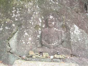 Oさんの車で7時半にロッジ前を出発し、山陽高速道を姫路西で降りる。 ロープウェイ駐車場から書写吹登山口までグルッと遠回り、車道横をてくてく歩く。 登山口まで45分かかるとは思わなかった。 書写吹登山口は、円教寺でご朱印を貰ったお遍路さんが、丹後に向かうために辿った古道で、山道にも歴史が刻まれている。 ところどころに往事の面影を残し、磨崖仏や石仏が登山遍路の我々を見送る。 1時間足らずで、ロープウェイ山頂駅から円教寺へ続く道に出た。 ほんの少しで、きれいなトイレのある円教寺の奥の広場に着き、広場から上に登ると書写山の山頂に着く。 ここには三角点はなく、山好きが作ったさまざまな山頂標識が並んでいる。 Oさん特製おにぎりや豆をもらい、ゆっくりと昼食が終わる頃に雨が降り出した。 少し離れた場所にある三角点を探しに行く。 GPSナビに入力した位置に三角点は見つからず、きっとイノシシが掘り返したのだろうと諦め、寺の方に戻る。 そのころから、傘が必要なぐらいの雨となる。 常行堂、食堂、大講堂とコの字型に並んだ空間は見る者を圧倒する。 ラストサムライのロケで有名なのは真ん中の食堂で、実に広々としている。 そこから少し歩いて石段を登り、西国第27番の円教寺に着く。 その奥が書写吹コースから辿った広場で、左回りに1周したことになる。 ロープウェイ山頂駅まで観音像が続く道を歩き、駅の手前から右に東坂参道を下る。 こちらのコースは、景色は良いが岩が多く歩きづらい。 丁石の数を減算しながら降りていくと、やがて民家の道に出て、10分ほどで駐車場に戻った。 「かまぼこ工房夢鮮館」で土産にかまぼこを買い、「ニューサンピア姫路ゆめさき」の広くきれいな温泉で汗を流し、帰路につく。 見つからなかった三角点を後に調べた結果、地図ルート作成時の間違いで三角点は 20mほど先でした。 この場をお借りし、関係者に多大なるご迷惑をおかけしたことを謹んでお詫び申し上げます。 (山) |