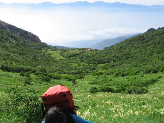 | 今回は避難小屋泊まりなので、テント以外の装備を入れたザックは結構重い。 ゲートからすぐに右に折れて林道を歩く。 登山口からは結構な登りだが、樹林が日差しを和らげてくれる。 昼過ぎに赤く塗装された越百小屋に着き、今日はこの避難小屋までと気楽に構えていた。 しかし!、小屋で聞くと避難小屋は小屋に泊った者が使うから、使用できないと冷たく言われる。 それなら、素泊まりで小屋に泊れないかと聞くと、完全予約制だからダメと冷たい。 ネットで調べた時には、避難小屋が使えないなんて書いてなかった! (調査不足の感はあるが・・・) 摺鉢窪避難小屋まで行くことにして、ペットボトルの水(500ml300円)を8本買って、先に進む。 越百で泊れないことが分かっていれば、もっと早く出発したのにと悔やんでも後の祭り。 2キロも重量が増えたザックで歩くが、自分のペースが落ちて皆の足を引っ張る。 コースタイムを大幅にオーバーして、仙涯嶺の岩を息絶え絶えに超えて、南駒ヶ岳に辿り着いた時には、暗くなっていた。 その頂上でテントを張るという3人連れがいたのには驚いた。 摺鉢窪避難小屋に着いた時は、先着者は就寝前なので、外で食事をして、出来るだけ静かにシュラフに入る。 がっくりと疲れた1日だった。 明日は、空木岳を抜けて木曽殿山荘から尾根を降りよう。 我々以外は、3時頃からほとんどの者が起きている。 トイレに外に出ると、満天の星に天の川が流れていた。 次に起きた時は、残っていたのは我々4人だけだった。 昨夜は暗くて分からなかったが、小屋の周りは素晴らしいお花畑だった。 この時期に、ほとんどの高山植物が見られるなんて、何ていい所なんだろう。 朝食を済ませ、稜線まで登り返し、空木岳に登る。 今日も足が重く、迷惑をかけそうだ。 空木岳でゆっくりして、木曽殿山荘側へ下る。 この下りが思ったより距離があり、岩場下りで時間がかかった。 山荘の先の水場で、冷水で締めたソーメンは誠に美味しかった。 ここからの下りがまたまた長く、どこかで見たような景色・登山道が延々と続く。 降り切って林道に出るが、避難小屋でもう1泊することにし、ゆっくりと夕食を作って休む。 小屋内で食事中に雨が通り抜けたようで、歩いてたら濡れていたかもしれない。 翌日、小屋から駐車場までは1時間半弱で着き、後は温泉、そば、観光と、ゆっくりと京都に帰る。 (山) |