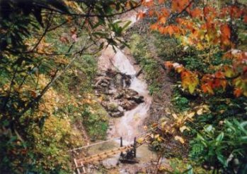 しかし、登山道は簡易橋を渡り、雨に濡れた岩をへつりで、気が抜けない。