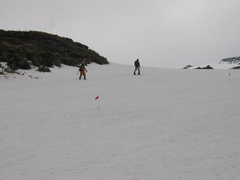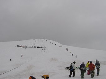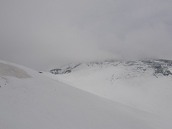 19時40分京都発、月山志津キャンプ場(雪で閉鎖中)の駐車場に翌日5時着。 東京からのN氏はすでに車中で睡眠中。 その横にテントを張り、しばし睡眠補充。 姥沢駐車場まで移動、リフトに乗るのに長蛇の列に並ぶ。 月山スキー場は4月にならないと営業しない。 雪を求めてスキーヤーが集まるので大混乱だ。 リフトを降りてシールを貼り、さあ出発。 片斜面のトラバースが続き、左足がだるい。 姥ヶ岳を左に過ぎて、だらだら歩くが高度は上がらない。 月山への稜線に出て見上げれば頂上はガスの中。 無理をすることもないさと、ここで終了、昼食にする。 シールを外し、さあ快適に滑り出そうか・・ん?滑らない! 斜度がないのは分かるが、それにしても滑らない。 雪が粘る!ブレーキがかかる! 他の者も同じようだ。 ごまかしながら下まで滑り、駐車場でスキーの裏を見ると、ねばねばしている。 T氏が一番ひどかった。 どうも木の樹脂が雪の上に付いていたようだ。 次の目的地の吹浦(ふくら)キャンプ場に移動。 このキャンプ場は素晴らしい! 林の中に自由にテントを張れ、一人1日600円のみ、しかも歩いて温泉に行ける。 一番素晴らしいのは、キャンプ場の川向こうに大きな鳥海山が眺められることだ。 翌日、鳥海ブルーラインのゲートが開く8時に合わせ出発する。 大平山荘の駐車場に車を置いたが、そこからでは道路を横切って行かなければならない。 車を進めて、取り付き前の駐車場に置いて、シールを貼り、登り始める。 初めの1時間の登りがきつい。 そこを過ぎるとゆるくなるのでやっと休憩。 それにしても雪原と呼べるぐらい広い。 帰りの滑りが楽しみだ。 少し登ると鉾立からのルートと交わる。 ルートには赤い旗が並んでいるが、ガスに巻かれたら広いだけに迷うだろう。 この山にはGPSナビが必需品だ。 御浜小屋(雪で埋もれている)あたりで落ち込んでいるのは鳥海湖(とりのうみ)だろうか? ここから先はまたまたガスで先が見えない。 七五三掛までは行きたかったが仕方がない。 休憩の後、下ることにした。 雪の状態は? うん、最高とは言えないが滑る曲がる。 登りでふうふう言った斜面をご機嫌で滑り下る。 あっという間に、取り付きまで滑り降りた。 帰りは海の幸を買い、昨日買った東北の山菜をさかなに早くから宴会に突入。 T氏が作ってくれる料理が酒に合う。 気持ちの良いキャンプ場の夜はふける。 (山) |