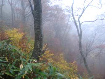 前日午後2時半京都を出発。 雨は降ったり止んだり、気持ちも湿っぽくなる。 午後6時頃蒜山I.Cを降り、夕食はB級グルメの雄、蒜山焼きそばを目指す。 焼き肉屋の蒜山焼きそばは、地鶏の焼きそばで、なかなかの味だった。 上蒜山スキー場の駐車場に車を止め、テントを設営、ちょうど雨も上がり助かった。 いつもは、あわただしく宴会をして就寝となるが、今日は余裕で、ゆっくりとビールとウオッカで乾杯、四方山話で盛り上がる。 時折テントを雨が叩いていたが、朝には雨も止み、何とかなるかと下蒜山登山口へ向かう。 しかし、願いもむなしく、登山口は雨の中。 今日登らねばもう次はないと、思いこんでるリーダーに引っ張られて、雨装束に身を固め、しぶしぶ登り始める。 道は粘土質で、雨に濡れ、ぬかるみ滑りやすい。 しかも、景色は乳白色の霧の中。 下蒜山までけっこうキツイ登りが続く。 自身に苦難を強いる行だと自分に言い聞かせながら登る。 下蒜山からは、置いた足がずれるような坂をながーく下る。 でも、笹原と霧の中の紅葉もなかなかステキだ。 稜線歩きも楽しいが、晴れていればもっと楽しいだろう。 中蒜山との鞍部のフングリ乢(たわ)は風の通り道、ごぉと風がうなる。 登りにかかっても、後ろで風のうなり声が聞こえる。 先ほどの下りより、登りは急だが、意外と早く頂上避難小屋に出る。 避難小屋の中を覗くと、思いがけず10数名の人が並んでいる。 「こんにちは」…、ん反応がない。 黙って皆に見つめられている。 何なんだと、思っている時に、外から先に中蒜山の頂上を踏もうという声で、外に出る。 展望もないし、小屋は一杯だから上蒜山に向かう。 雰囲気・持ち物等を考慮して、さっきの団体は韓国か中国からの登山者だと結論づける。 今まで、誰にも出会わなかったのに、ここからは10名ほどの団体3組、小パーティー数組とすれ違う。 やはり、上蒜山からの登山が多いのか。 上蒜山頂上に出て、三角点まで、藪こぎで往復する。 霧雨の中、乾杯、昼食タイムを取る。 上蒜山登山口までの長い下りを黙々と下ると、だんだん霧が晴れ、視界もよくなり、やっと紅葉を楽しめる。 最終の牧場でタクシーを呼び(縦走中もタクシーの電話案内看板あり)、下蒜山登山口まで自家用車を取りに行く。 タクシー代、3,490円也。 蒜山やつか温泉で、冷えた体を温め、生き返った感じになる。 夕食は、B級グルメ好きのリーダーの要望で、津山のホルモンうどんなる物を食べることになる。 わざわざ院庄で高速を降り、またまた焼き肉屋でホルモンうどんを注文する。 内容はホルモン入りの焼きうどん、チヂミも注文し、そこそこ美味。 雨でも楽しかったけど、晴れならさらに楽しかっただろうと思いつつ帰路につく。 |