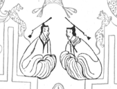 この2体の副像は、鏡には類例が無い独特な形態です。しかし、中国本土から発掘された遺物のなかに似た形態の絵があります。それは中国湖南長沙にある馬王堆1号墓から出土した帛画(絹の上に図像を描いたもの)です。