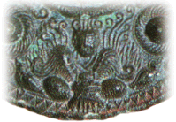 梅原氏はもう一体に西王母と彫られているので、この神像を無条件に東王父とされています。しかし、一般に、同一鏡に彫られた西王母と東王父は類似したデザインになっており、この意匠の違いは東王父でない別の神を描いているのではないかとも考えられます。