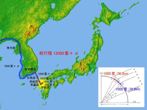 この「里」に関しては古田武彦氏が「短里説」を主張され、谷本茂氏が『周髀算経』の「一寸千里の法」の計算式から、一里を76~77mとされています。古田氏のいわれるように、魏朝は全面的に「短里」を採用していたと考えるのは少し無理があるようですが、この行程の解釈としてはまったく妥当なものだと思われます。
