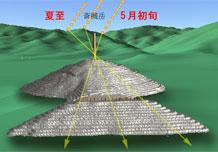 また小川氏は同書で、箸墓は農事のための太陽運行観測に使われたという考えを述べられました。後円部中央に柱を立てて、夏至前後の斎槻岳付近からの日の出を、前方部に置いた埴輪列への射影によって観測し、田植えのカレンダーとして使用したというのです。