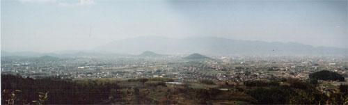 穴師から見た大和三山と箸墓(画面右下) 撮影:大石信治