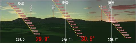 | 観測点 | 冬至落日角度 | 南側角度差 | 春分落日角度 | 北側角度差 | 夏至落日角度 |