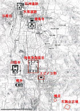 飛鳥の遺跡配置図(奈良文化財研究所『奈良・藤原京展』2002年に加筆)