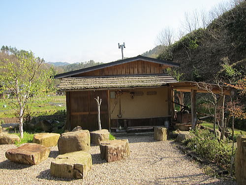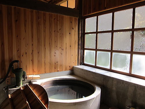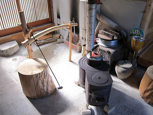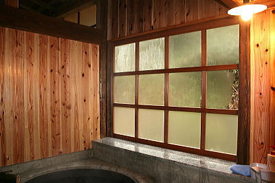 五右衛門風呂建物 屋根中央の煙突から煙が出ています 五右衛門風呂 窓を開けると新緑が広がります 小鳥の鳴き声も聞こえます 浴室内はやわらかな照明でいやします 五右衛門風呂のたき口です 冬は薪ストーブで室内を暖めます