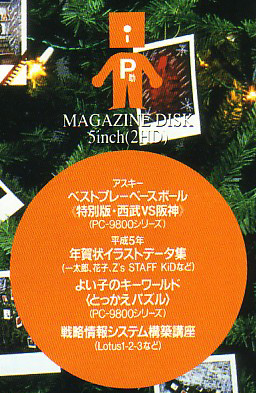| 右は、表紙の一部を拡大したものです。 付属のディスクはこれまたなつかしの5インチです。 ベスプレは〈特別版〉として、トップで載っていますね。 …ところでこの雑誌、12月号と言うことは、その発売日はちょうど日本シリーズ開催の頃になるのではないでしょうか? 編集〆切までに優勝球団が決まらず、思い切って阪神に決めてしまったのでしょうか? |