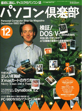 前説はこのくらいにいたしまして、さっそく資料の方をご覧いただきましょう。 「パソコン倶楽部」1992 12月号 表紙を飾っているマシン名が懐かしいですねぇ。 Windowsとあるのは3.1でしょうね。この頃は使いにくくて普及してませんでした。 |
