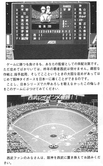 | せっかくですから本文ものぞいてみましょう。 「全国の阪神ファンに捧げる」 というキャッチコピーが泣かせます。 西武ファンもプレイするんですが…というツッコミは却下された模様です。 |