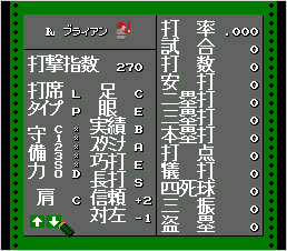 選球眼が悪い選手(大豊、新庄など)は打率が稼げないので、打撃指数を大きめにすると良いです。また、代打の切り札(八木、吉村など)、というような選手もやや大きめ(270〜290)に設定すると、雰囲気が出ます。