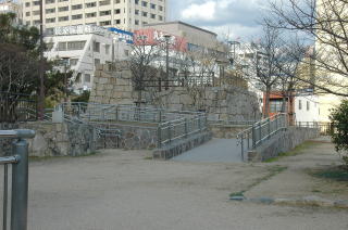 花隈公園は丘のように盛り上がった公園であり、全体が城をイメージしたような石垣造となっている。その最上部に天守台様の石垣がある。勿論、城の遺構ではない。 |