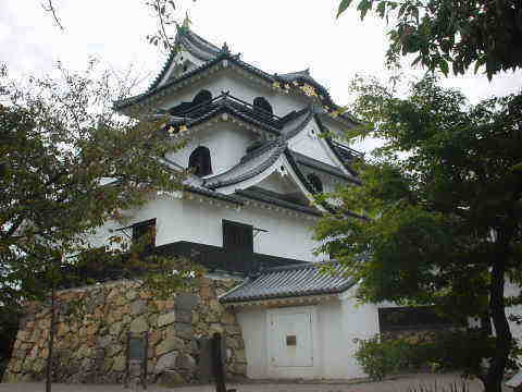 入母屋破風、切妻破風、軒唐破風の各破風が多用され、また二階と三階の窓はすべて華頭窓となっており、凝った装飾になっている。 三階の高欄は廻縁となっておらず、装飾的なもの。 外壁は白漆喰塗り、一重目は腰羽目板張。 小規模ながらも華麗な望楼型天守。 |