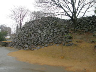 | 本丸内の櫓台 堀に面する石垣は打込みハギであるが、この櫓台の石垣は野面積みである。 |