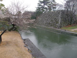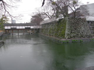 | 内掘と本丸石垣 本丸には四重の天守があげられていた。人質櫓と、宗門櫓の2基が現存しており、大手櫓門、西の丸隅櫓、東の丸隅櫓、着到櫓が復元再建されている。 |