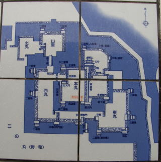 本丸の二方を東丸と西丸(二の丸)で囲み、さらに二の丸の二方を三の丸で囲む、典型的な梯郭式縄張りである。 |