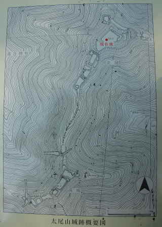 | 太尾山城は、北城と南城からなる「別城一郭」と呼ばれる構造であり、麓の油谷神社から南城へ、青岸寺北城へと登山路が整備されており、それぞれ登山路を25分登った比高約170mの太尾山山頂にある。 |