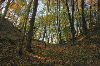 | 鎌刃城へは、番場の集落の近くのこの大手口から、山道を登ること約30分。 | まず最初に、この堀切に着く。最大幅25m、高さ9mの大堀切である。 | |