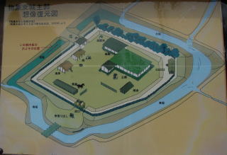 | 城の敷地は現在、畑になっている。向こうは、北西隅に残る土塁の一部。 | 現地案内板の、復元想像図 |