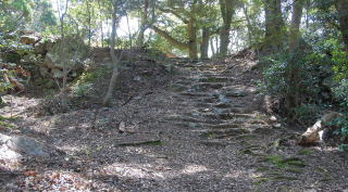 | <アクセス> 国道27号線のJR小浜駅裏手の「後瀬山東」の信号を北側へ入ると、すぐ左に愛宕神社がある。この愛宕神社の鳥居下の階段から、後瀬山の山道に入ることができる。5分ほどで曲輪群に至り、さらに5分ほどで主郭に到達する。愛宕神社の前に車を置くスペースがある。あるいは「後瀬山東」の交差点のコンビニを利用することもできる。(2011.04.17) |