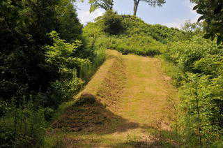![]() 本丸と三の丸の間の帯郭に復元された土塁 |