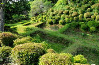 西ノ丸と西櫓の間の障子堀 山中城で注目されるのは、なんといっても障子堀と畝堀。 障子堀は、空堀の底に畝を障子桟状に設け、堀を越えようとする敵兵の動きを制限するようにしたもの。 障子堀は後北条氏の城に特徴的なものとされる。 |