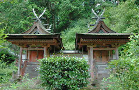 左:春日堂 右:白山堂 いずれも、切妻屋根の正面に庇を設けて入母屋風にした春日造の一間の小社。 |