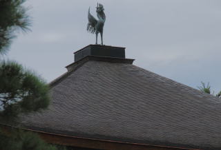 | 銀閣の名称は、祖父の金閣にあこがれた義政が、銀箔を貼る予定であったためといわれるが、俗説らしい。 | 杮葺の宝形造の屋根に、青銅の鳳凰が東面して載る。 |