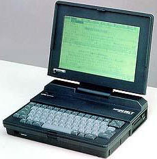 液晶画面のラップトップパソコンです。画期的だったのですが 、型名から分かるようにPC-9801ではないため膨大なPC-9801シリーズのソフトが使用出来ませんでした。 当時の技術ではこの大きさのマシンフルスペックPC-9801の機能をすべて搭載するのは不可能だったんでしょうか?それとも新たな展開をねらったのか今となっては分かりません。