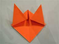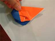 (2)・上の写真を上下さかさまにして、カブトを折るのと同じように折ります。 |