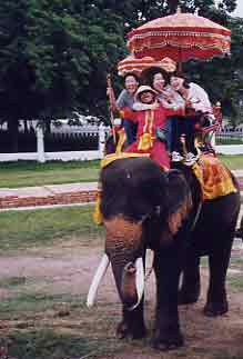 その様子がかなり楽しく見えたらしく、横を通る車はクラクションをならし、白人の観光客は私たちを写真におさめていた。 『ぞうさんハイ』になっていた私は、ぞうさんの背中を見ながらある事に気付いた。鞍の真ん中に座っていた私がいなくなっても、鞍のバランスは保たれる。ということは私はぞうさんの生背中に乗れる、コレってすごいやん!三人乗りバンザーイ! 気付いた私にバンザーイ!!! ちゃんとパイムアンさんに断って、憧れの象の背中に着陸ぅ。ぞうさんの背中の皮膚は思っていたほど硬くなく、剛毛でもなかったよ。背中からは大っきい耳もよく見えたし、歩調に合わせて私の背中も動いた。 いつも動物園で遠くからしか見れなかった象を、身近にどころか肌で感じた。そして、象乗りツアーは終了。 |
