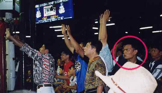 ムエタイのチケットをとるとき 料金は1000バーツ。 カリプソオカマショーが360バーツだったことを思うと 「ムエタイはリングサイドで見よう」 これは、大金を払ってでも近くで迫力ある試合を見ようという意味ではありません。 >外国人はリングサイドで見よう。 >金網で後方とは区切られているから安心。(TERRY) 行ってみてようやく理解できたひと言でした。 ・・・タイした国だよTHAILAND