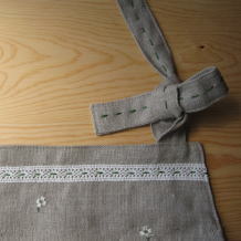 胸元にトーションレースを飾りハンドステッチしました☆ 肩紐にもグリーンの刺繍糸でステッチしました |