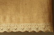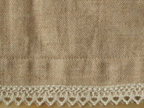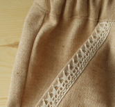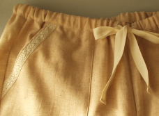 | ポケット口に生成りのトーションレースを付けて可愛くしてみました。 通した綾織テープもオーガニックコットンです。 (両側ポケット付きで、便利です☆) |