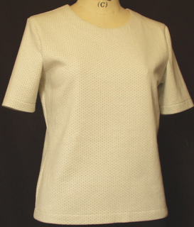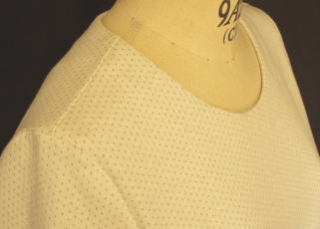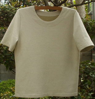 | 裏側のグリーンが表にドット状に出ている凝った生地で、 素敵です。衿ぐりは程よいあきにしました。 |