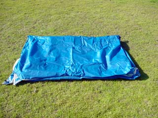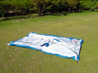 テントのたたみ方.通気性のある部分を内側にし,グランドシートを外にして,2つにまず折り畳む. |
