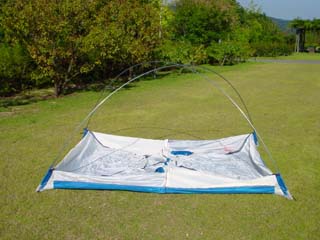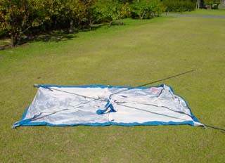 テント本体をの完成.テント本体上部の素材は,通気性はあるけれど,防水性がない.グランドシートは,防水加工がされている. |